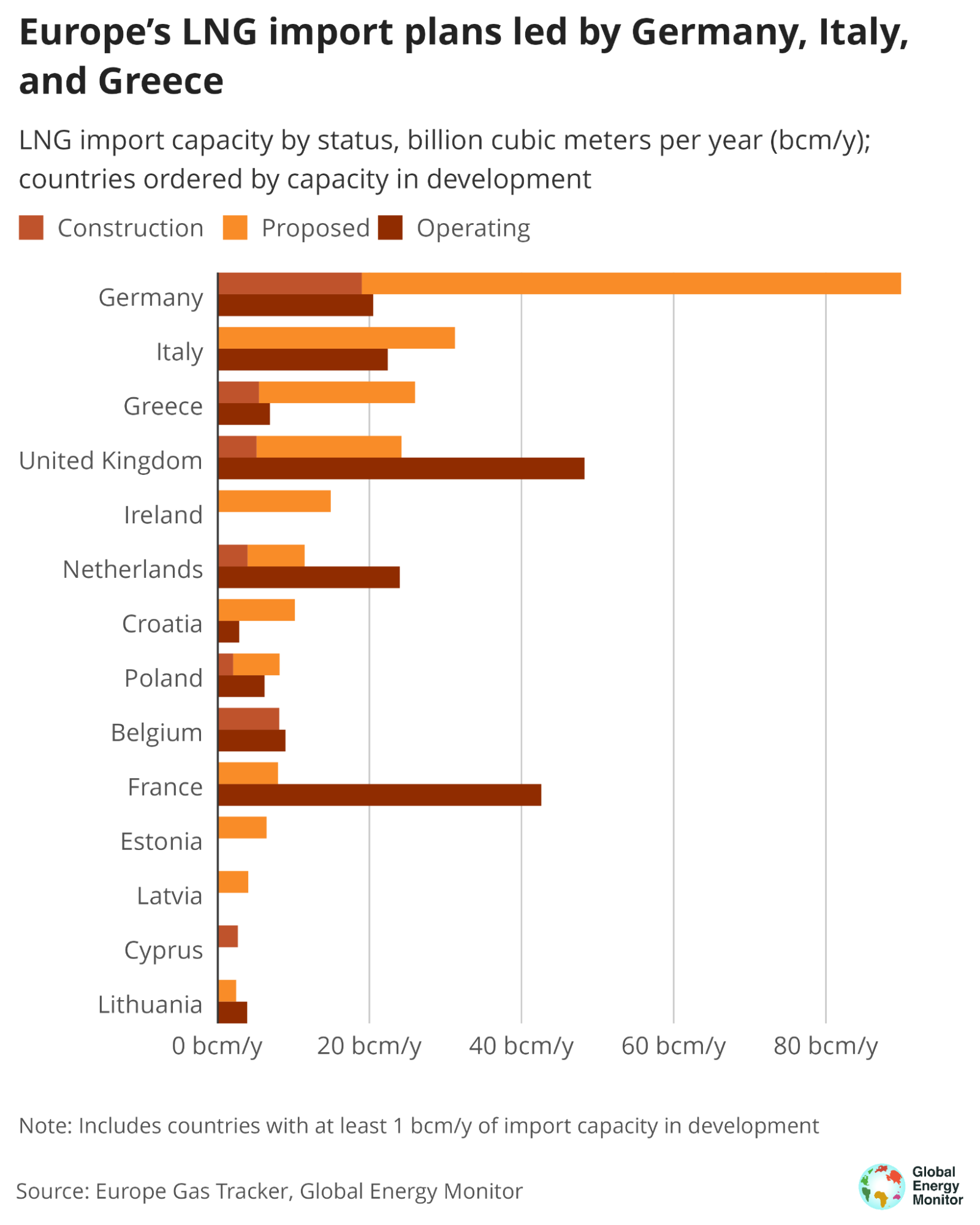 Germany, Italy, and Greece, which are developing the most gas infrastructure in Europe, are together responsible for half of these plans (€45.3 billion).