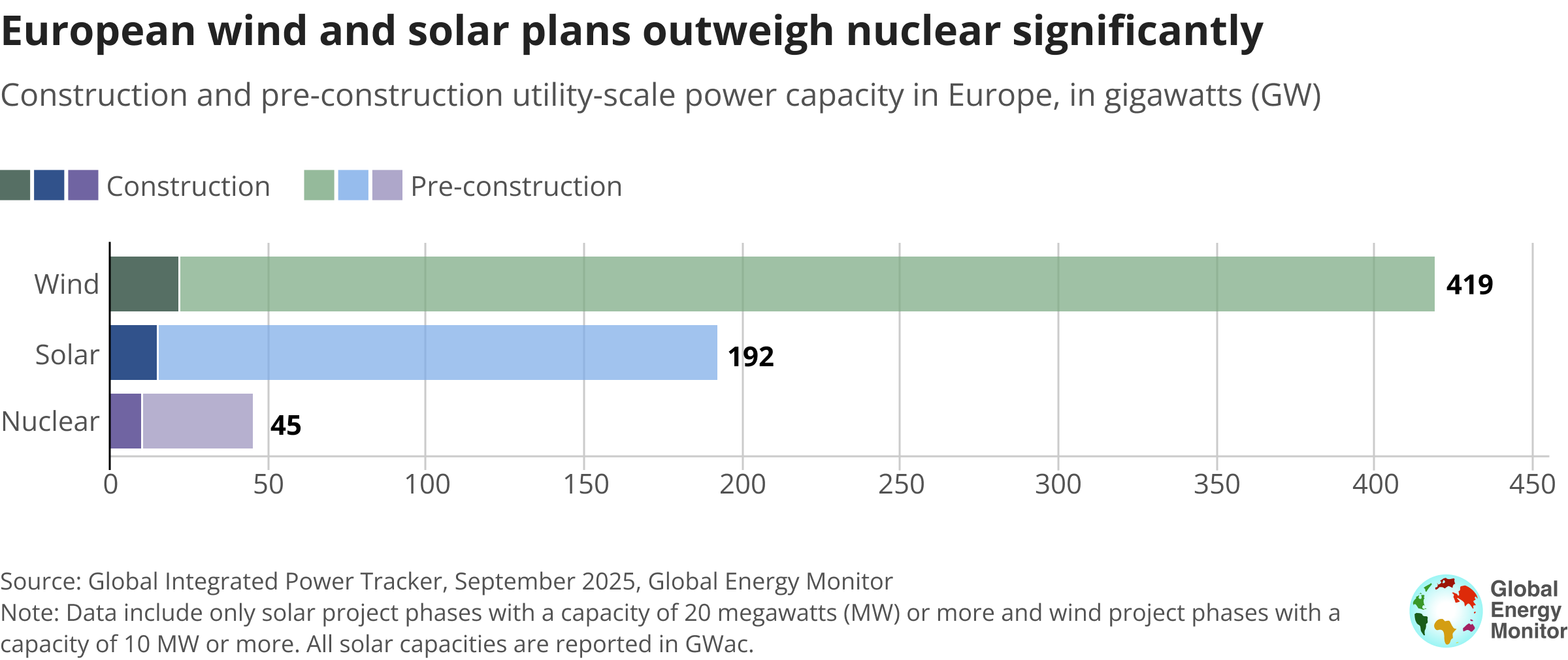 - Europe’s nuclear sector has lost 122 GW of planned capacity to cancellations, more than the operating nuclear fleet of any single country worldwide. An additional 68 GW has been retired, and 90% of the remaining reactors are more than 35 years old. In contrast, European wind and utility-scale solar capacity under construction or in pre-construction outweighs nuclear by a factor of more than 13 to 1.