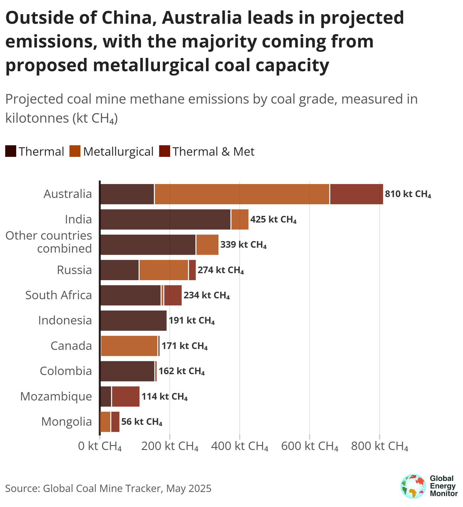 China, without doubt, dominates emissions across all coal grades, largely due to its unmatched volume of proposed coal mining capacity across various coal ranks. Outside of China, Australia is the second-largest emitter from proposed coal projects, with over two-thirds of its projected emissions coming from metallurgical coal capacity. Russia and Canada follow as the next largest emitters from metallurgical coal proposals.