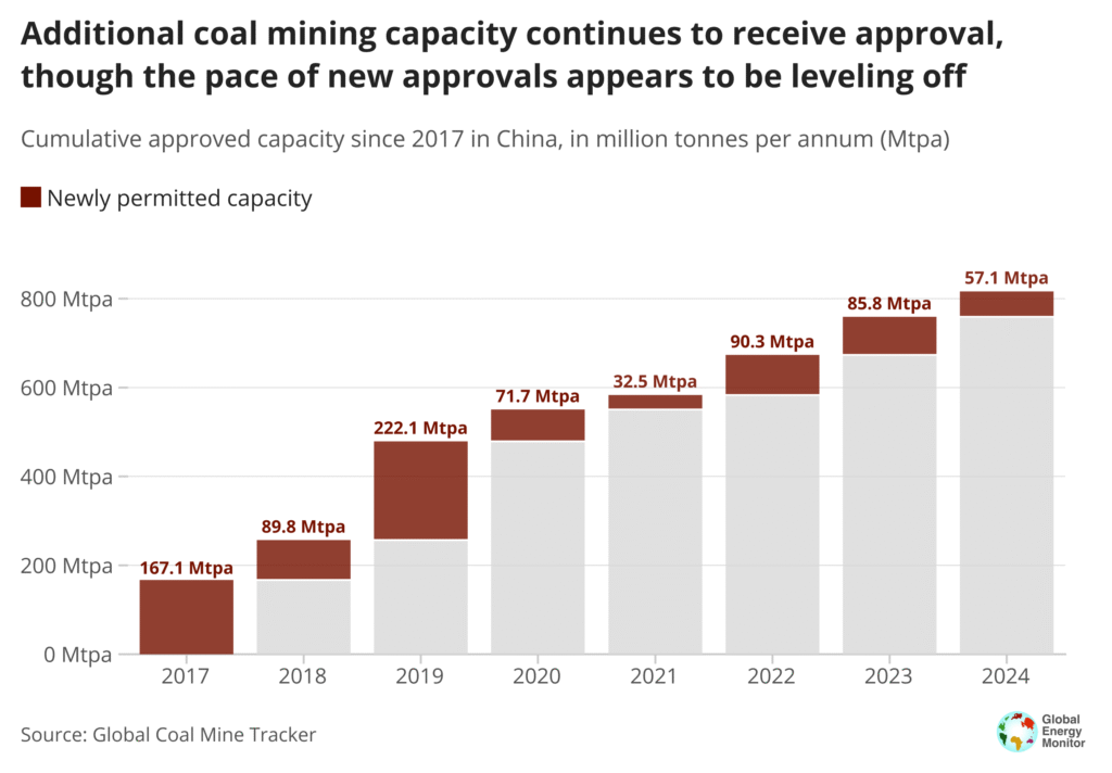 As of April 2025, China maintained a total of 1,350 Mtpa of proposed coal mine projects (including expansions), accounting for 60% of the global proposed capacity. This amount surpasses the combined operating coal capacity of Indonesia and Australia, the world’s third- and fourth-largest coal producers.