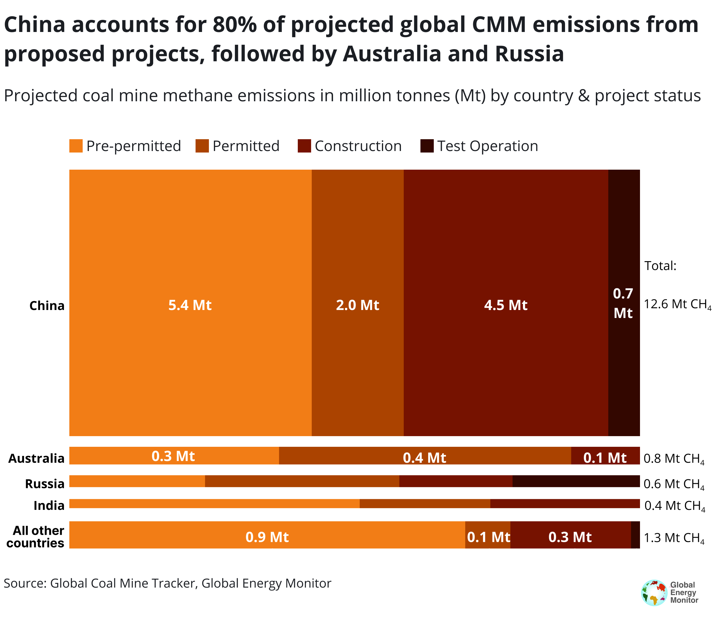 China is the source of the largest projected increase in global coal mine methane emissions, accounting for 80% of estimated emissions from proposed projects worldwide. The country has 456 proposed coal mines under development, totaling approximately 1,350 Mtpa in planned capacity. If fully realized, these projects could emit an additional 12.6 Mt of methane annually, according to GEM estimates. With nearly 40% of this capacity already under construction or in test operation, about 5 Mt of new emissions per year may be effectively locked in.