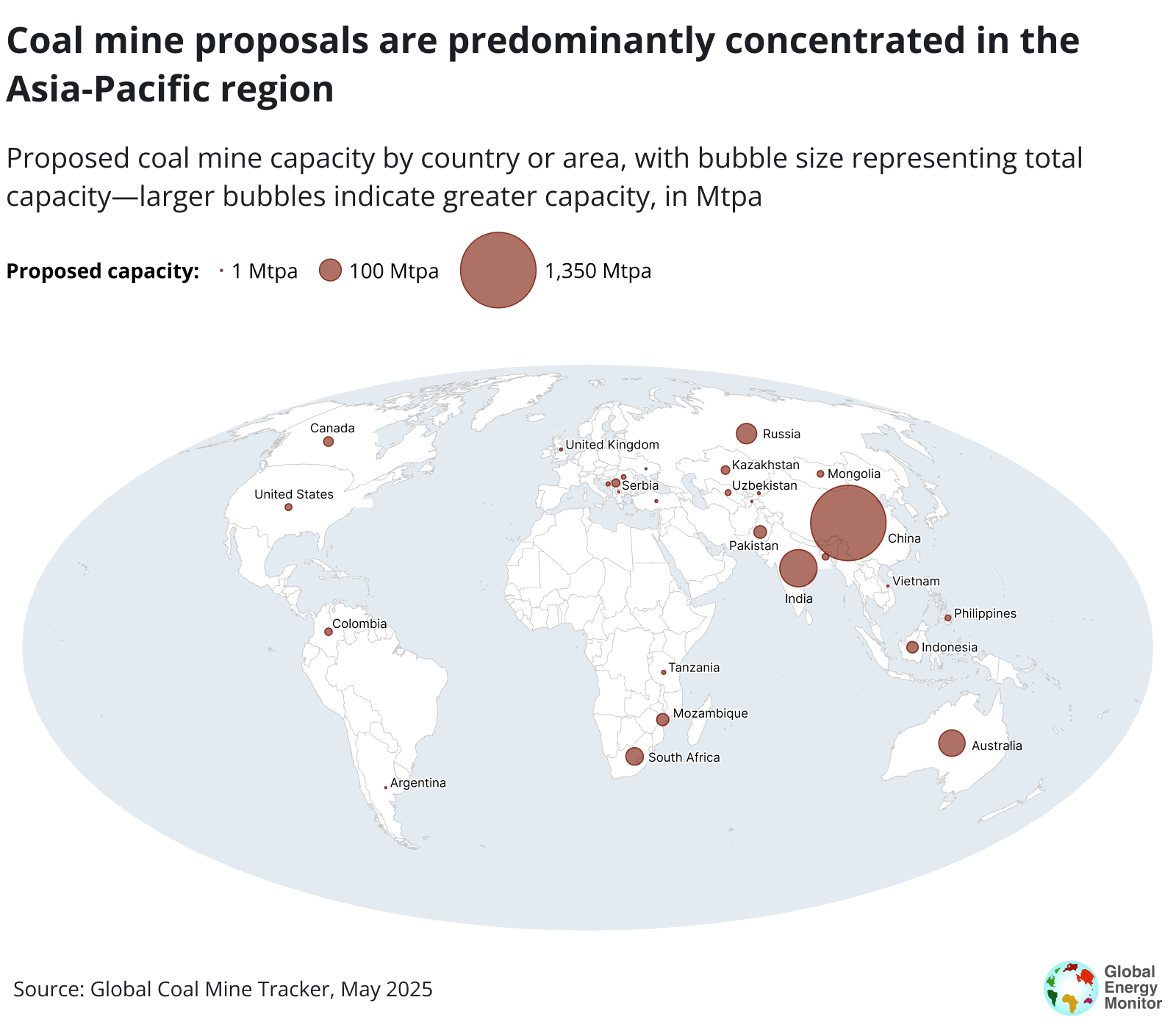 - China, India, Australia, and Russia comprise nearly 90% (1,942 Mtpa) of all proposed mine developments. China alone has 1,350 Mtpa in development — more than all other countries combined.