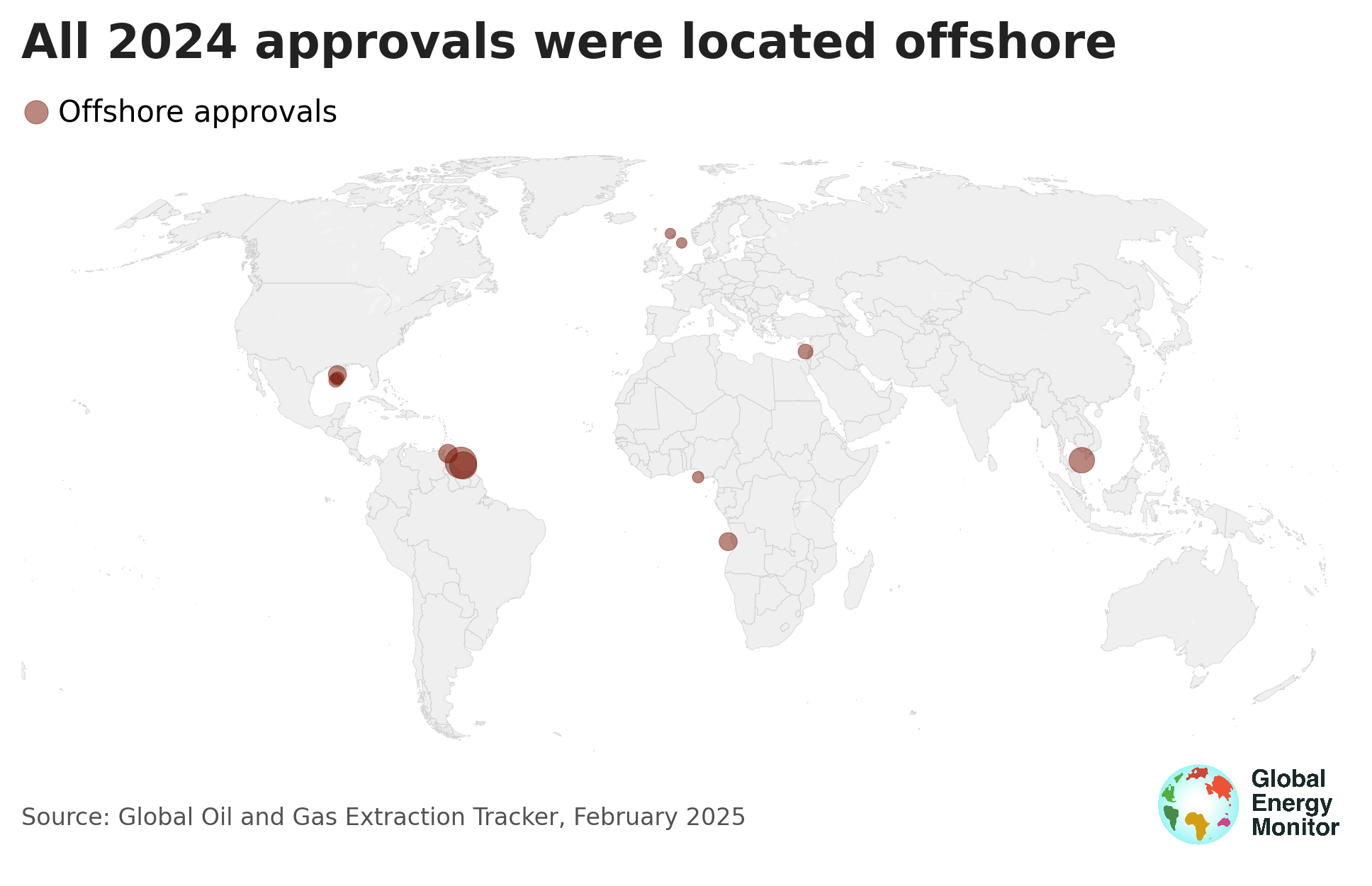 Global Energy Monitor’s Global Oil and Gas Extraction Tracker (GOGET) shows that the vast majority of new projects discovered, sanctioned, and started up in 2024 are located in the oceans. The industry continues to ignore warnings of the risk oil and gas extraction causes, leading to extreme climate impacts. Instead, companies and countries continue to push into uncharted waters. Not only do these projects harm the ecosystems they exist in and run the risk of environmental catastrophes, they run afoul of the scientific consensus that any new oil and gas field is incompatible with limiting warming to 1.5°C and break clear calls to protect the climate.