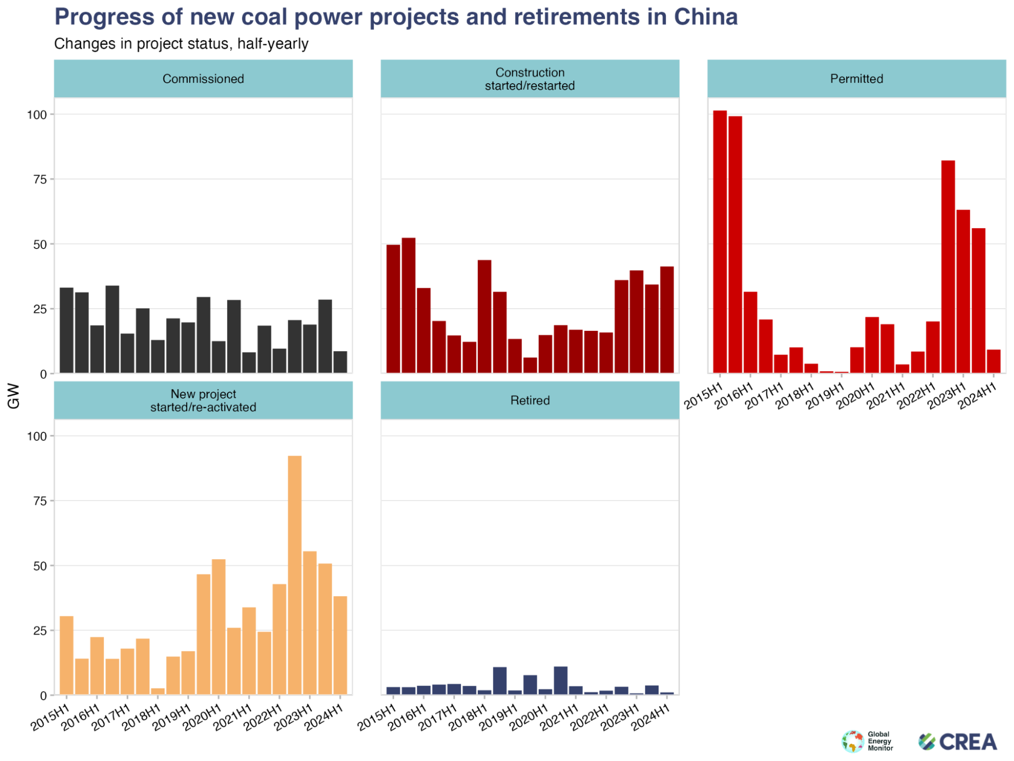 Despite these encouraging signs, significant challenges persist. In the first half of 2024, construction began on over 41 GW of coal projects, nearly equaling the total that started construction during all of 2022 and constituting more than 90% of global new coal construction activities. Moreover, the government's goal of bringing 80 GW of coal-fired capacity online in 2024 indicates a potential increase in project completions in the latter half of the year, from 8 GW commissioned in H1 2024.