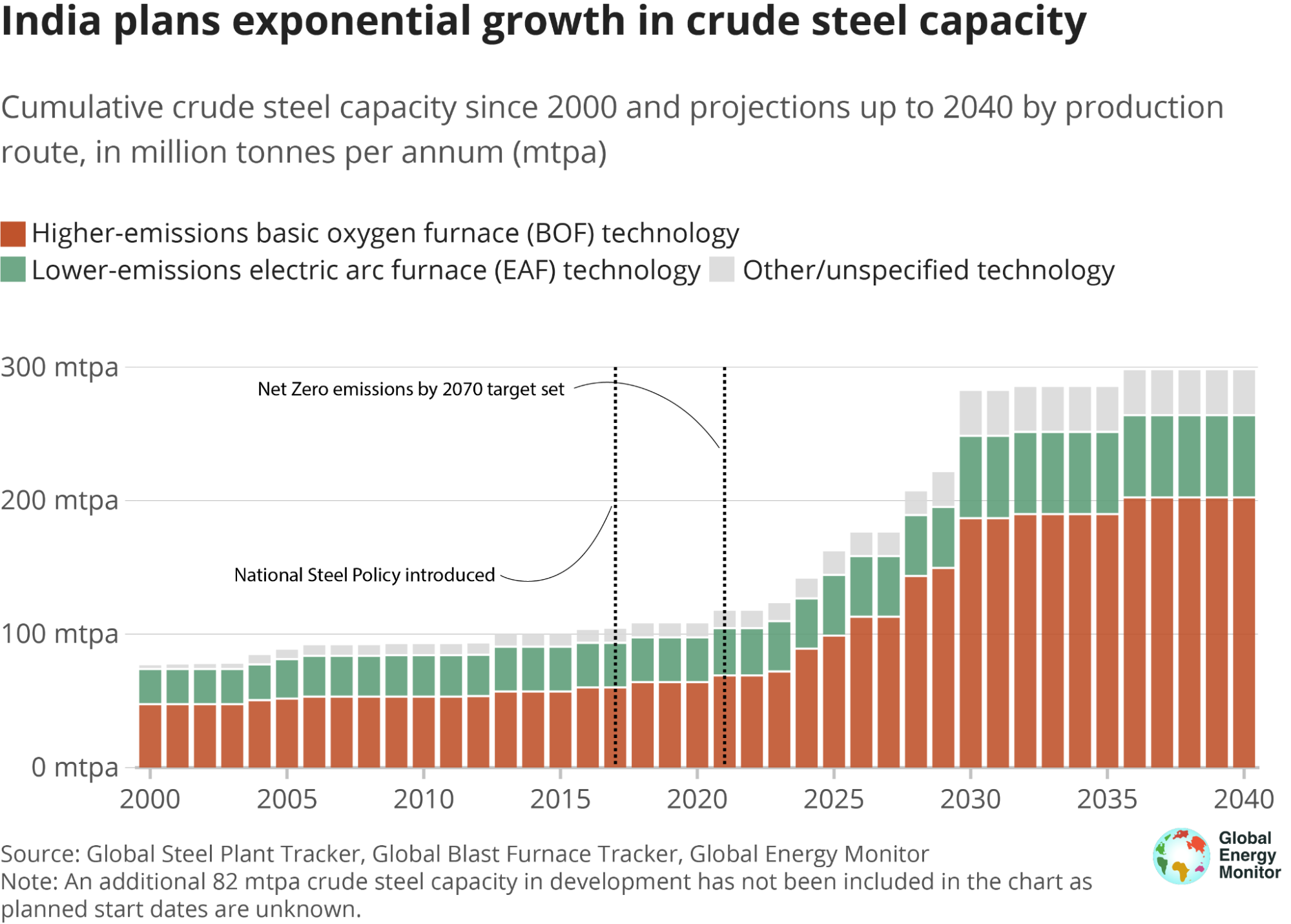- Unmatched industrial growth and heavy reliance on coal: Driven by its National Steel Policy, India's growth plans position it as the country with the largest steelmaking capacity under development, surpassing even China. This growth reinforces India’s status as the second-largest steel-producing economy, with the emissions-intensive blast furnace-basic oxygen furnace continuing to be the dominant production route for the foreseeable future.