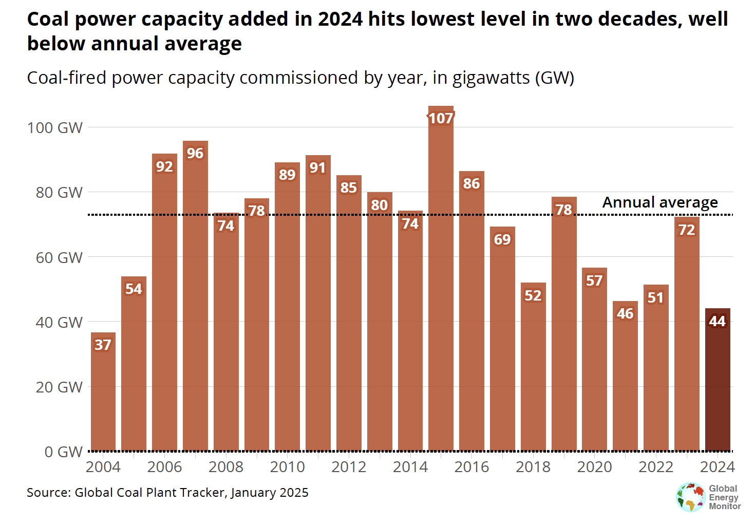 Data from the Global Coal Plant Tracker show that 44.1 gigawatts (GW) of coal power capacity was commissioned while 25.2 GW was retired in 2024, resulting in a net increase of 18.8 GW. The capacity commissioned was nearly 30 GW below the annual average for 2004 to 2024 (72 GW) — a sign of the continued slowdown in global coal construction.