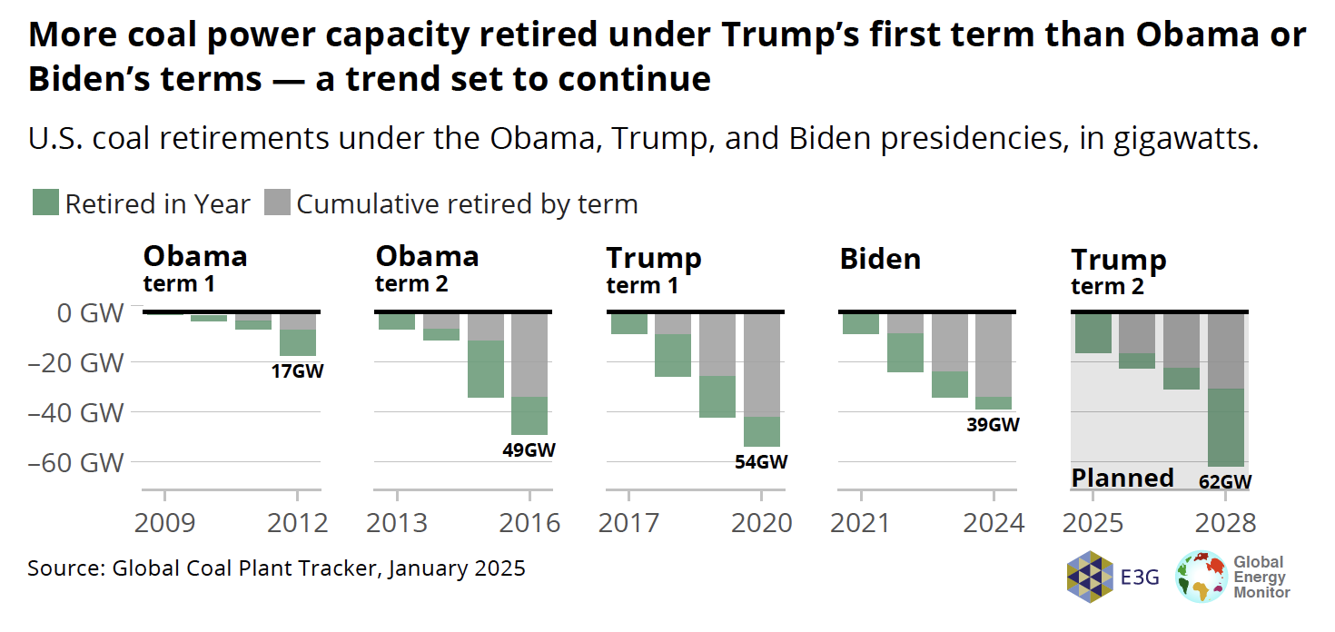 Coal plant retirements in the U.S. are expected to pick up over the next few years. Despite the Trump administration’s support for coal, more coal was retired during Trump’s first term than under Obama or Biden — a trend that is set to continue.